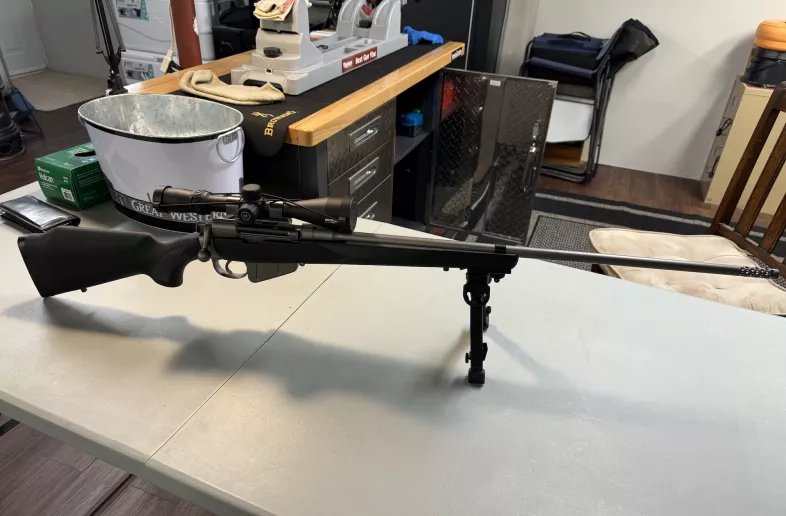 Rifle has been updated with synthetic stock and forearm, full length 26" barrel that has been ported, barrel and other steel parts have been cerakoted, c/w bi-pod and one 10 round magazine. rifle comes with weaver side mount and 1" rings (The rifle scope does NOT come with the rifle - If a rifle scope is needed I have some around that could be discussed).