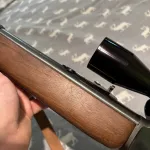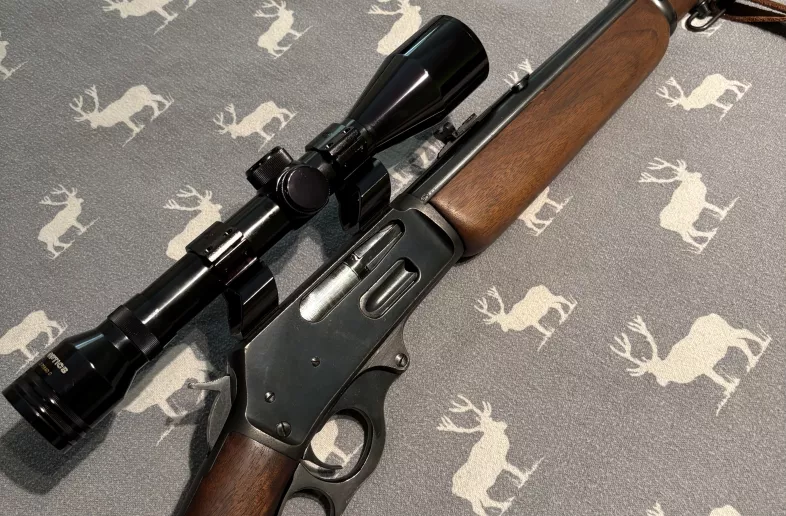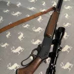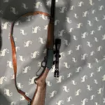 Older Marlin in good shape, one small ding in the fore end. Cycles smooth, has hammer extension and see through scope rings. Hooded front sight, buckhorn rear sights and a tasco 2.75x40 scope, leather sling.
