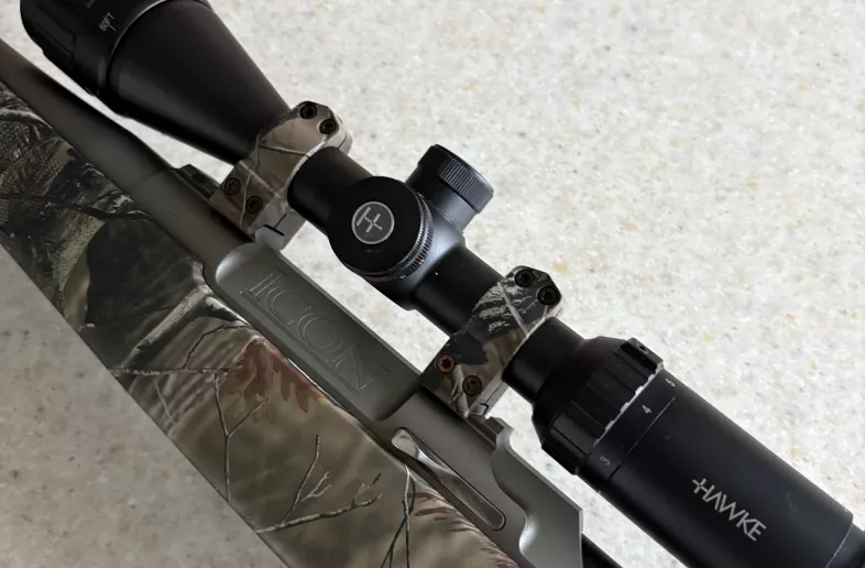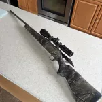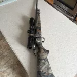 Used and in excellent shape Thompson Centre icon 308. Camo synthetic stock with grey ceracoted barrel and action. Comes with sighted in hawke 3x9 40 illuminated scope.