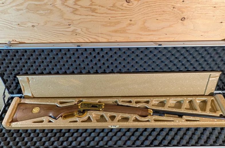 Commemorative edition Winchester 30-30. Unfired, in original box. Special "Alamo" edition featuring Davy Crockett, Sam Houston on inlaid emblem. Check my other ads too.