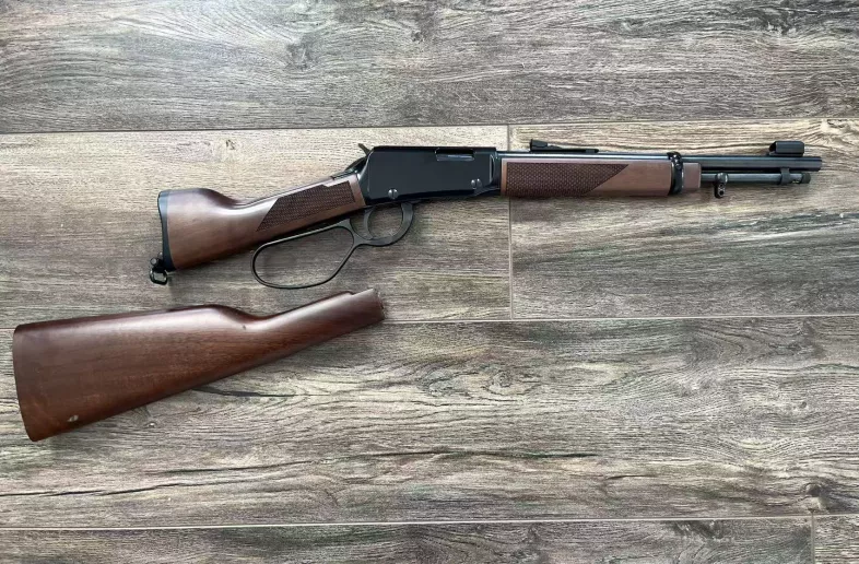 Selling my Henry Mares Leg (.22 Mag). It comes with an upgraded rear sight, sling swivels, and the full stock (the butt plate of the full stock is missing).