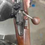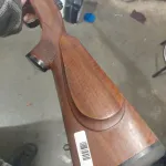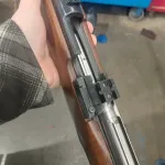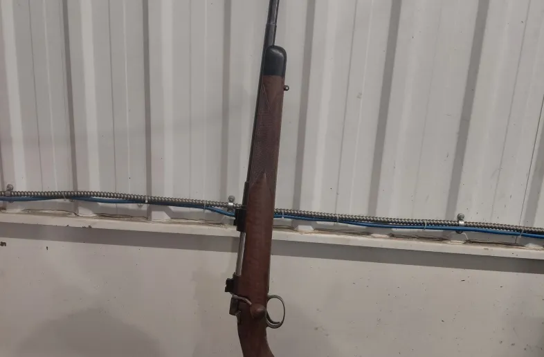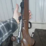 Husqvarna M96 with 20" medium heavy barrel. Has weaver base to mount a scope, enlarged wooden bolt knob, a nice recoil pad and a side safety.