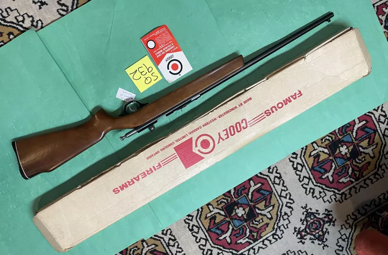 COOEY 39 ,22 CAL SINGLE SHOT, NOT MINT BUT CLOSE TO IT, AS NICE AS THEY GET. NOT MUCH MORE TO SAY ABOUT IT. SHIPPING IS $50 WITH NO BOX OR $75 WITH BOX ( POST CANADA CHARGES A SURCHARGE FOR PARCELS OVER 100 CM LONG )