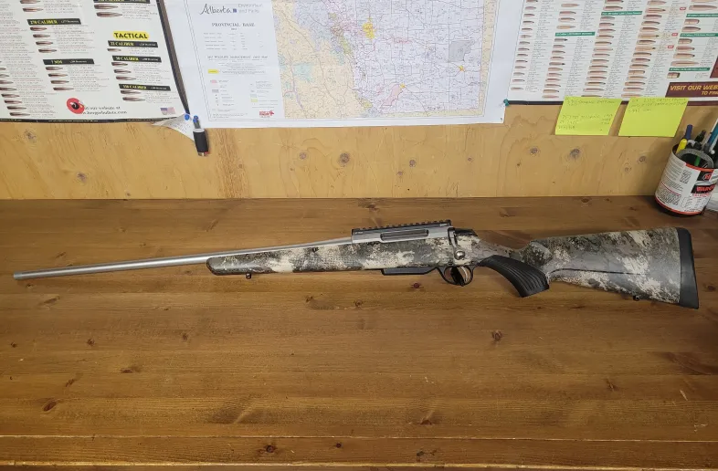 Selling a tikka t3x stainless chambered in 300wsm. Octane camo stock. 150 rounds +/- fired, shoots 178 eldx, 175 lrx and 180 sst bullets sub moa, average of .75. Muzzle threaded by insite arms. Includes mdt scope base, installed yo Dave trigger spring, muzzle thread protector and one magazine. Rifle has been hunted and proven to be extremely effective on game. A couple minor scuffs on the barrel from either being fielded or safe kisses, see pictures. Stock has never been used and is in new condition. Very clean, extremely smooth and great trigger. $1250 shipped. PAL verification required.
