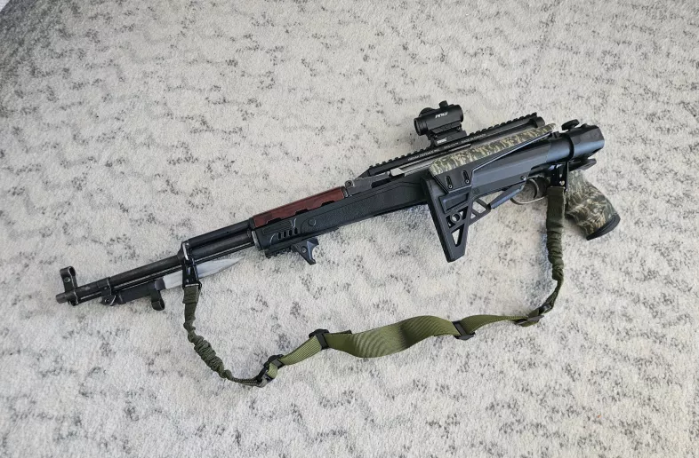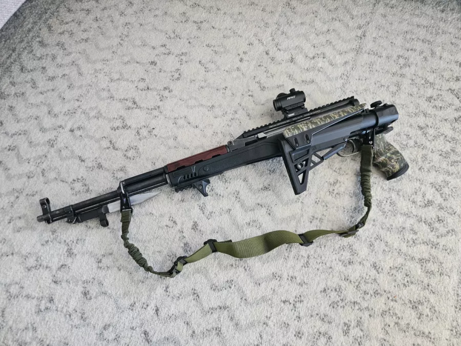 ATI Strikeforce Gen 2 Folding stock, Kodiak Defense 101 Top Rail with Pinty Red Dot, Custom Half-length Bayonet and a MilSpec rifle sling!
