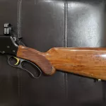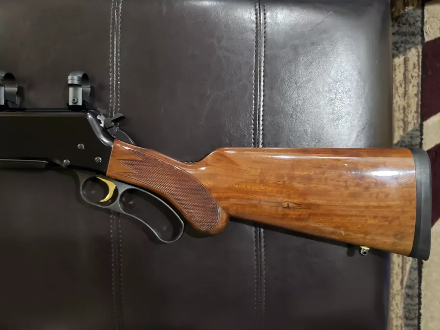 For sale is a Browning BLR lever-action rifle in .243 Win. caliber. It has a 20" barrel. This model has a pistol (curved) grip walnut stock with gloss finish, and hand checkering. It also has bulit-in iron sights. It comes with a detachable box magazine. It also comes with a set of 1" rings, mounted on a two-piece picatinny rail. It is in great condition with a few minor handling marks.