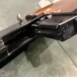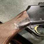 The rifle remains in solid working order with strong rifling. The walnut stock shows handling marks in addition to the repaired area. Bluing on the barrel shows light scratches and use wear. The magazine and receiver display normal cycling marks. Overall, a dependable hunting rifle with cosmetic wear consistent with field use.