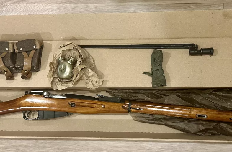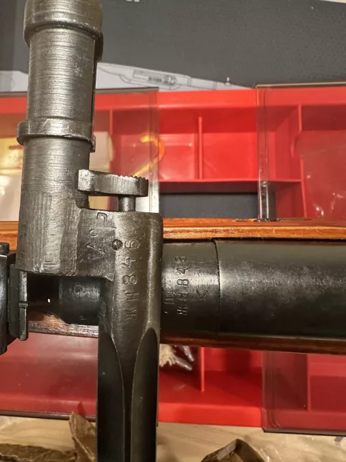 Comes with a bayonet, oiler, pouch and cleaning kit.