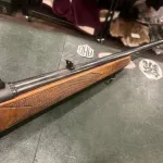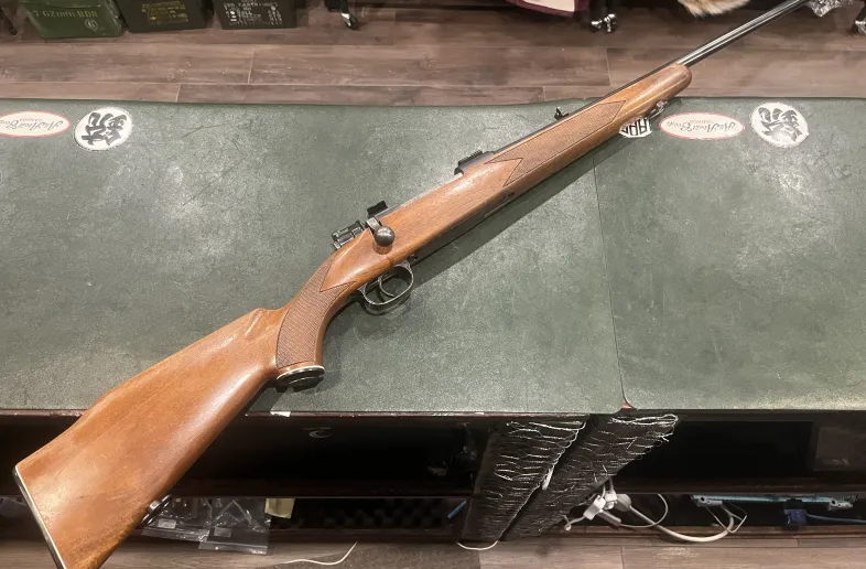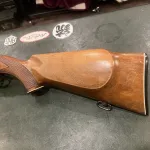 The rifle is stocked in a classic walnut sporting stock, featuring checkering at the grip and fore-end for a secure and comfortable hold. The stock shows honest handling marks consistent with age, with no major cracks or structural issues. Metal finish remains in good overall condition with normal wear, reflecting careful use rather than abuse.