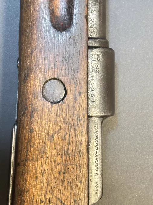 Bore is fair and wood has normal marks as a gun seen battle and militia use, some wear marks but no cracks but there is a repair, was cut to use a k98style band spring but it was correctly repaired in original configuration.
