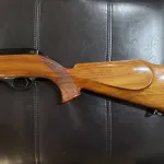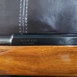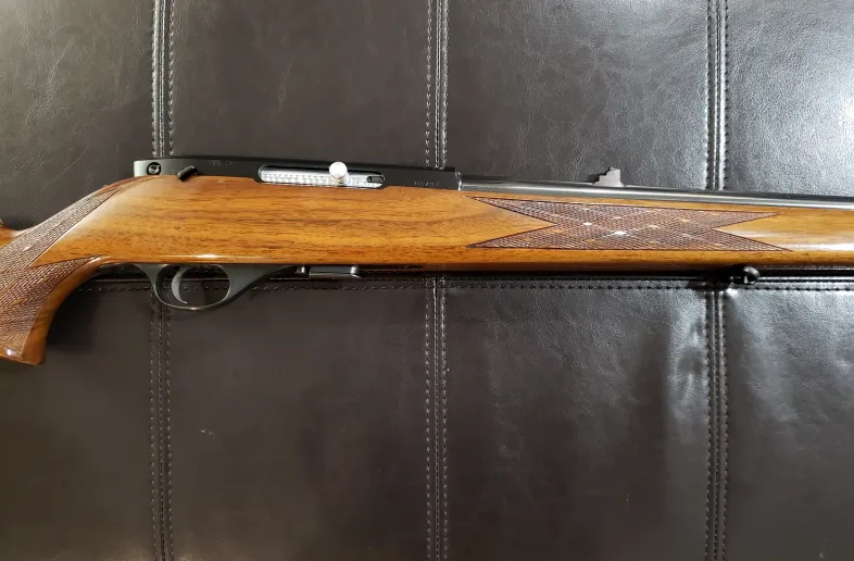 For sale is a rare Weatherby Mark XXII semi-auto rifle, chambered in .22LR. It has a 24" barrel (blued) with built-in iron sights. This rifle features a wlanut stock with diamond checkering (c/w sling swivels/studs). This model has a top-tang safety. It comes with a detachable 5-round steel magazine. It is in excellent condition, with low round count. This rifle is made in Italy.
