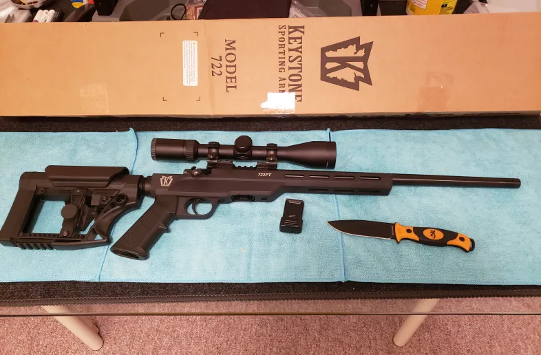 BNIB Keystone Model 722 Precision Trainer Bolt Action Rifle 20″ Threaded Barrel, ModX PT Chassis 7+1 .BNIB WEAVER 3-9 x 44 scope & rings.