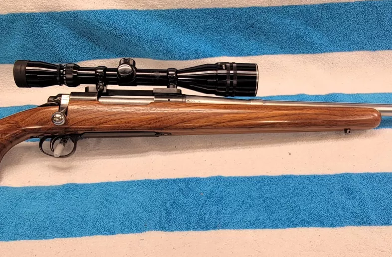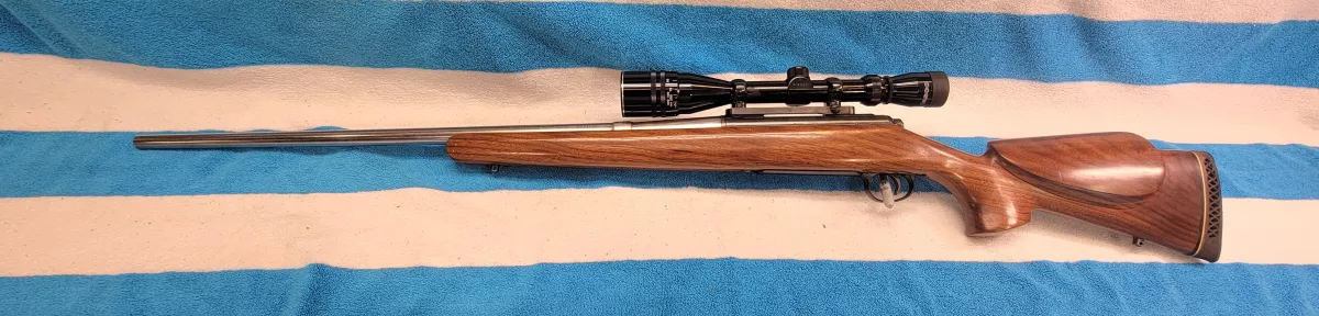 Remington Model 721 in 300 Weatherby Mag. It started life as a 300h&h but was reamed out to a 300 Weatherby Mag as verified by a gunsmith. Stamp still says 300h&h. There are tools marks on the recoil lug and trigger pins. Safety was repaired and verified by the same gunsmith but the trigger is still the original. Triggers from this timeframe are suspect but all tests have shown this one seems fine. That said a new trigger assenbly is suggested.