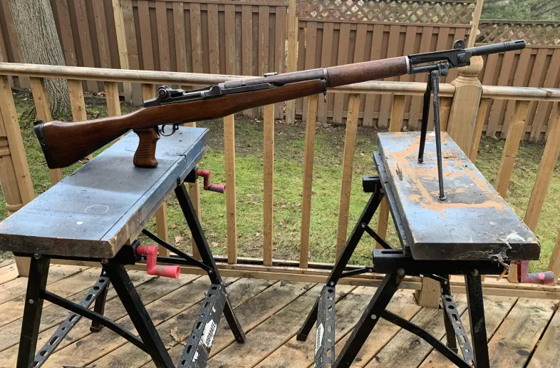 Next, just like a quick change artist, remove the tri-comp and bi-pod, re-install the lower fore-stock and a standard Garand flash hider (taking all of two or three minutes); and you have a great hunting rifle (that I carried on a single point bungee sling for about ten years while moose-hunting. Easy to carry).