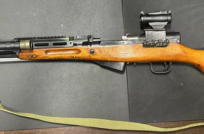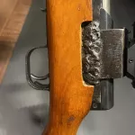 Stock has been cut to accomodate a scope mount. Its welded onto the receiver, blocking out the Made in China words. Its also got a Rubberized Extended Charging Handle