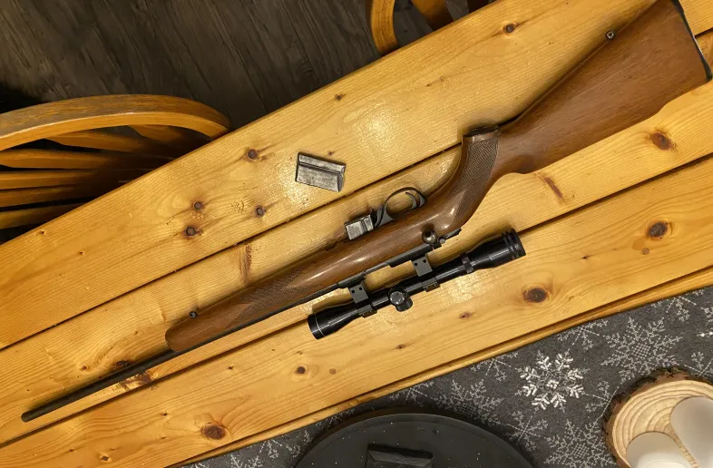 Squires Bingham model 1500 .22 magnum. Works good and comes with spare mag. Stock had crack and was repaired as shown in pics. Comes with tasco scope. Asking $400 or try your trades. Not interested in shipping at this time. PAL a must.