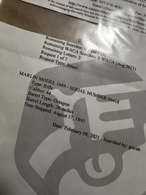 Up for grabs is a Marlin 1889 short rifle with 20 inch barrel chambered in 44-40 calibre. is an excellent condition with a good bore and comes complete with factory letter. $2500 shipped