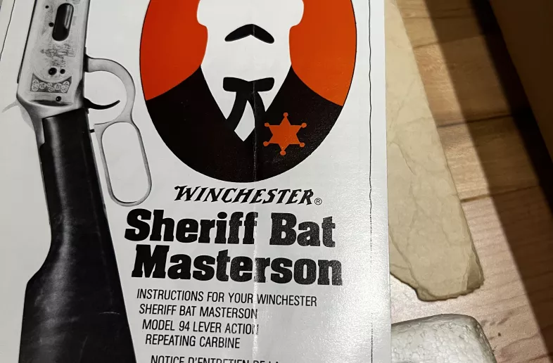 Winchester 30-30 Commemorative Bat Masterson 20” carbine . Rifle is new and unfired in the original box complete with hang tag and warranty card . Born in Canada Bat Masterson was a famous US Lawman and gambler who worked with Wyatt Earp. This beautiful rifle features high-quality walnut stocks, an engraved silver plated receiver, and barrel bands. This is my last Bat Masterson, so don’t miss your opportunity to purchase. $2500 shipped.