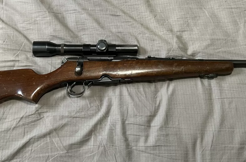 Has weaver wide angle 4x scope, on it from previous owner before my late dad purchased it..