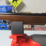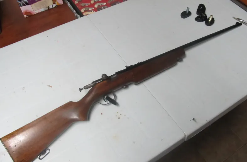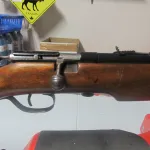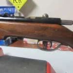 Listed for sale is my Cooey Model 75 bolt action single shot rifle. It shoots any of the .22 short, long, or long rifle cartridges. It appears to have been roughly re-blued sometime in the past, and there are scratches and marks on the barrel where the bluing has worn or been rubbed off (see picture 10) The dark walnut "whale belly" stock with sling swivels is in very good condition with a few scratches but no damage or cracks. There is no serial number.
