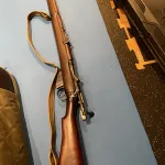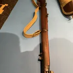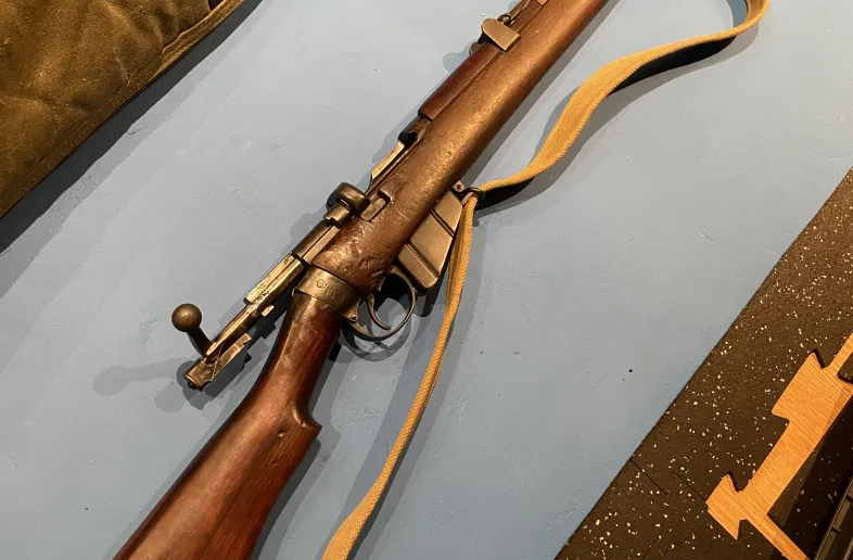 Here I have a Lee Enfield Number 1 Mark 3 made in England in 1916 in full military configuration. Numbers do not match, but the stock shows a C> . It also has a WWI-era sling. The forend appears to be rebuilt.