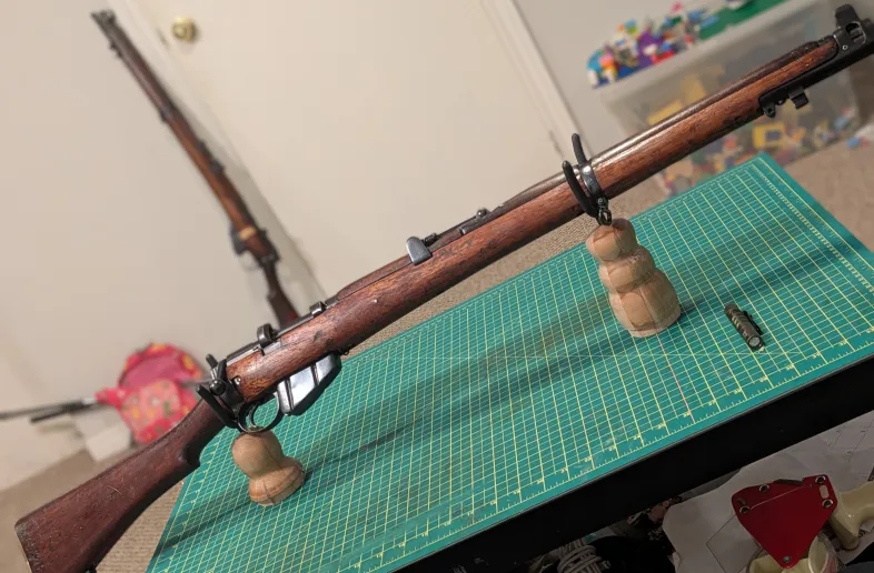Lee Enfield No1. Mk3 of unknown origin, restored to military configuration with DP donor furniture and hardware. Cycles without issue although I haven't had a change to get it out to the range yet.