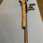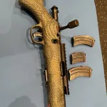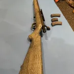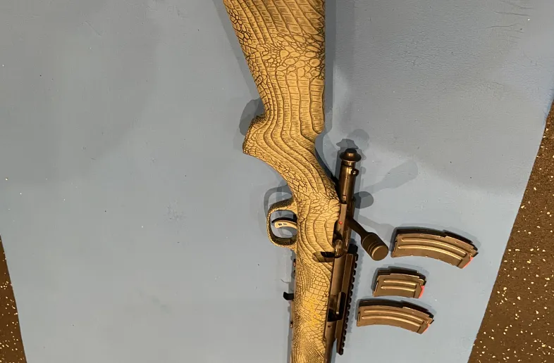 A great condition Savage Mark 2 with a Troy Landry alligator skin pattern. Also has a fluted barrel, an A2 birdcage “flash hider” for what that’s worth on a .22, and three magazines. These are awesome, accurate guns.