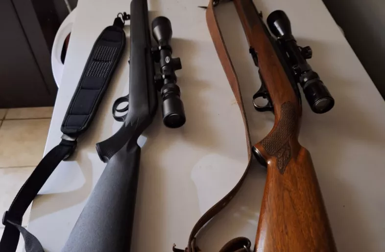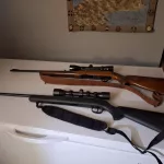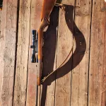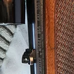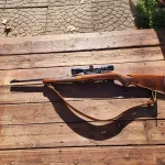 308 Winchester Semi Auto. Not a great scope but good for young eyes. Well taken care of