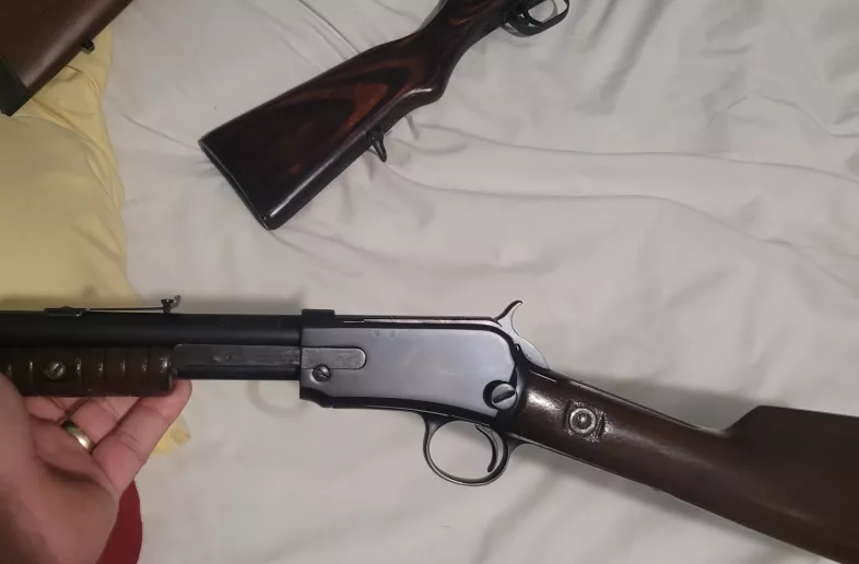 I have a winchester 1906 that has been recently refinished. Chambered in 22lr works as it should. Somewhat ugly repair on the wrist. More pis available, no shipping