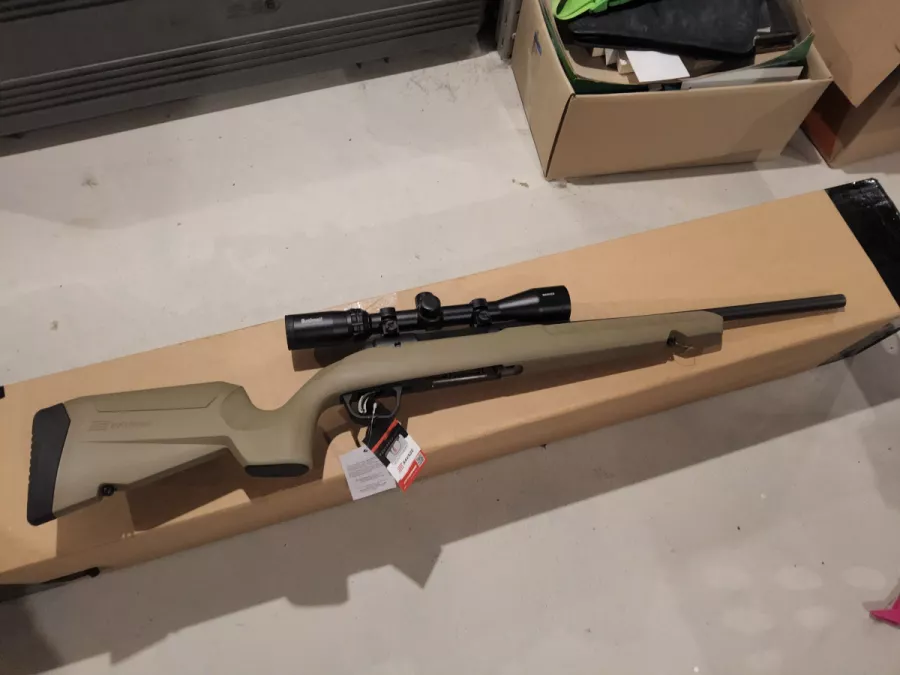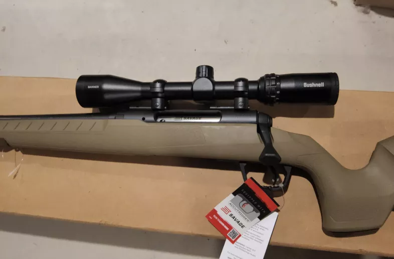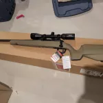 Brand new in the box, Savage Axis II compact, left hand bolt action in 350 Legend. 18" barrel, reduced length of pull, new style stock. 4 round clip magazine. Has a Weaver 3-9x40 scope included. Only taken out of the box and test fired. Very low recoil (advertised as 20% Less than .243 win.)