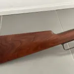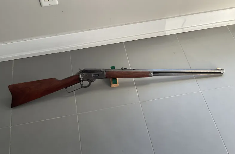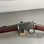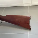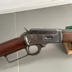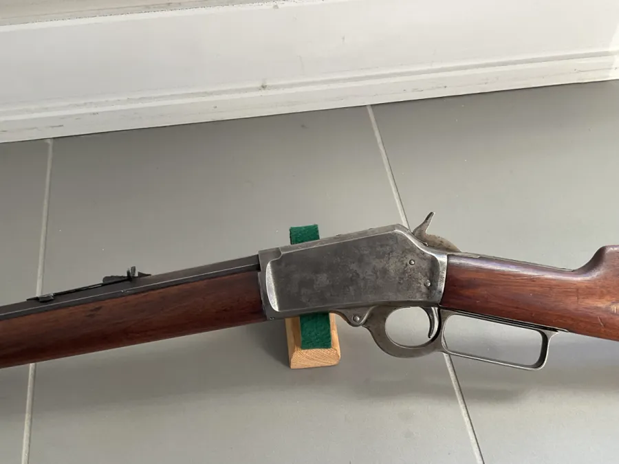 Was my Dads rifle. He owned it approximately 20 years. Overall, except for a couple turned screws, a real clean, honest, good looking rifle. Marlin modified shotgun butt. Full octagon barrel and magazine. Sheard blade front sight. (Note: There is a touch of white nail polish on it for his eyes which can be easily removed). Barrel blue turning, frame was case coloured but faded. Not cleaned. All original wood varnish. Wood is very nice, though there is a small impression, which can be steamed out. Action, hammer etc all very tight and very smooth action as well. Overall a nice example of a hard to find model and caliber, and most have extra holes, etc. From what I can see, made in 1907 (ish).