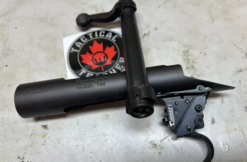 You’re looking at a Remmy 700 Short Action receiver with an upgraded Timney trigger tuned to 2 pounds or just above a kilogram. Wide trigger shoe is present. This short action , right hand receiver has a 0.473” bolt face for your .308 .243 .260 7mm-08 .22-250 6.5cm 6 cm future builds.