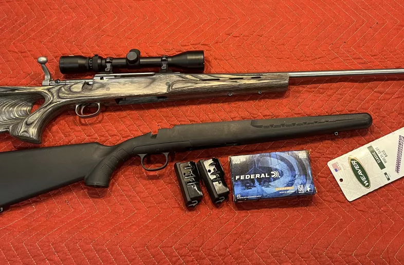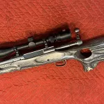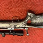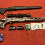 Savage Axis, stainless, 308win, Boyd’s thumb hole stock in pepper with metal trigger guard. 2 magazines, Bushnell 3-9x40 scope. A weaver full length pic rail. And the original plastic stock.