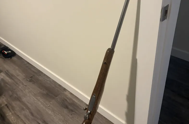 Beautiful stainless Remington rifle model 700 in 300 Rum thumb hole stock hinged floor plate magazine . Comes with scope VX-3 Leupold 4.5-14 by 50 with Duplex Crosshairs mounted and sighted in.