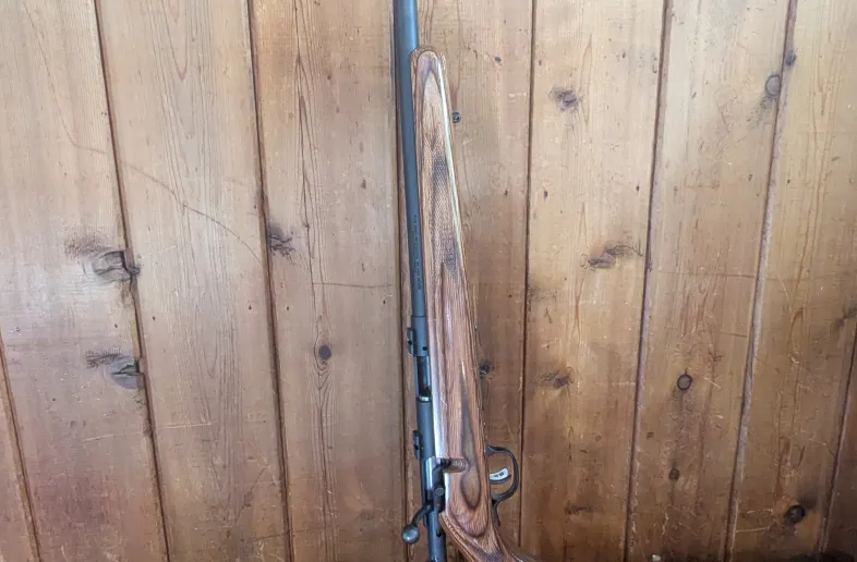 Savage Mk II BV - Laminate stock, heavy barrel. This rifle was hell on hares and grouse - many have fallen before it. Accordingly, it has some scars. Some old rust around the muzzle. The face of the muzzle and the crown itself are clean. Shoots lights out. Bases included.
