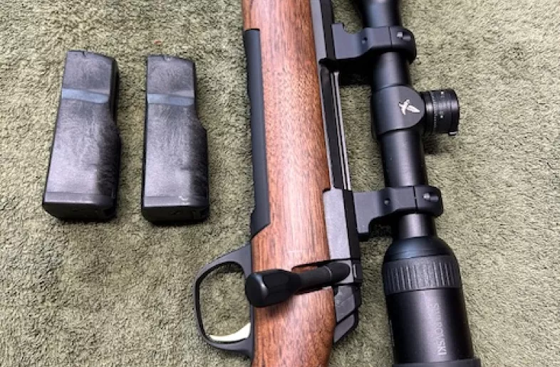 Gun is sold separately now. Scope is available. Excellent condition, "Left Hand" beauty sighted in, clean and ready with Swaroski Z5, 2.4 -12 X 50 mm, simple duplex crosshairs, extra clip mag, muzzle break, 26 " barrel, 1 - 8" twist, NO issues. May consider separate. Serial number BRJP 2360 BYM .. 35X
