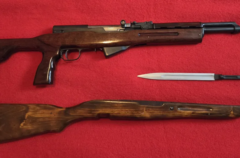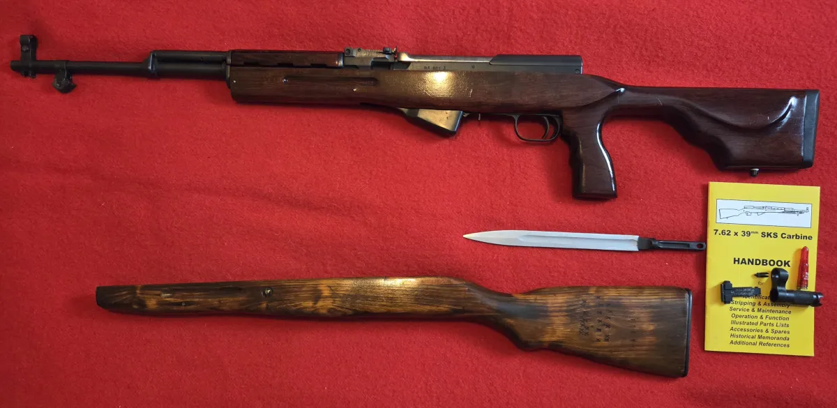 Tula 1956 letter series "D" sks in excellent condition. Comes with a handmade pistol grip stock with rubber recoil pad. Aftermatket peep sight attached.