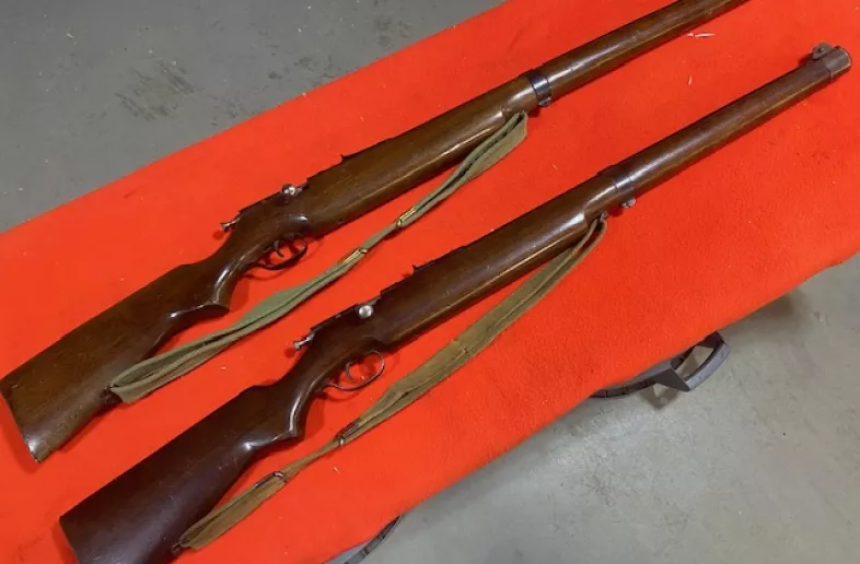 Top is the Civilian version Cooey Model 82 single shot bolt-action .22 caliber target rifle intended for use in training Cadets,and junior shooting clubs (I learned how to shoot with one of these 60 years when I was in boy scouts). This one has no military marks Comes with web sling . $500.00