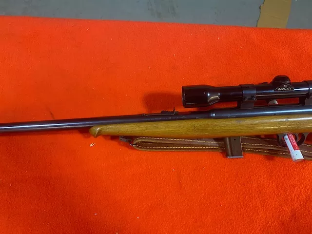 This is an A6 model, the base type. Circa 1950s–1960s, It is chambered for .22LR, with an 8 round magazine, open sights and Redfield 4 X scope. Barrel Length: 21 1/2” ,the bore is bright, the rifling is sharp. . It fires from an open bolt so simple, very few moving parts exceptional accuracy. One-piece hardwood stock featuring a semi-pistol grip with smooth forend. The stock has minor handling marks, nicks, and light finish loss. There are no cracks or structural damage. This Gevarm is not restricted. $950.......NOW $900 shipped