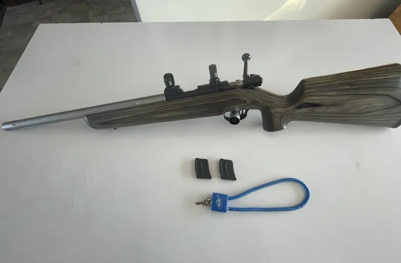 Model SVT (stainless varmint target). Never fired. Heavy stainless fluted barrel, laminate stock with raised cheek piece and palm swell. Includes 2-5 shot mags, scope base and 1" rings. Pal required. Shipping & insurance on buyer's dime.