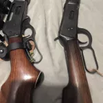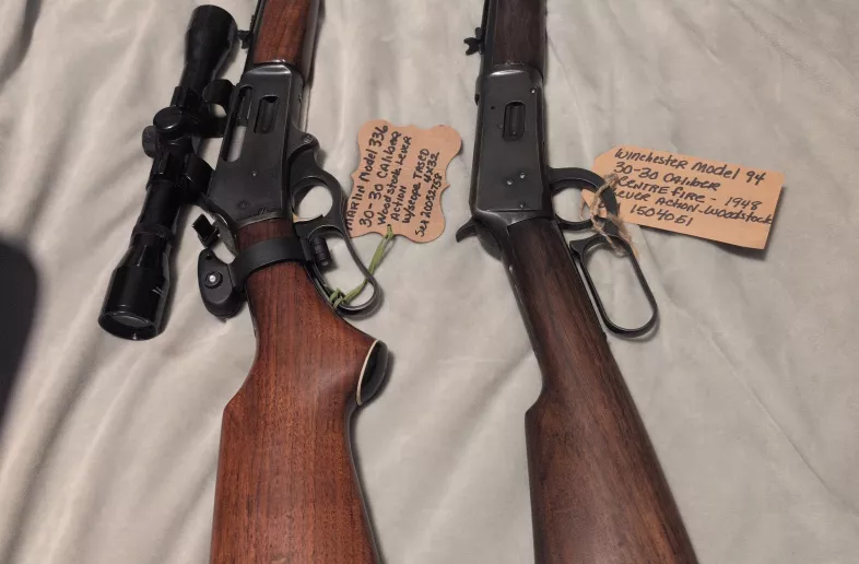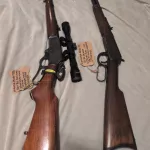 The left one is A Marlin 336 c/w see through rings and scope very nice condition made in USA the right one is A Winchester model 94 made in 1948 very small hairline crack by the reviver good condition Tex or phone only 306 621 5400