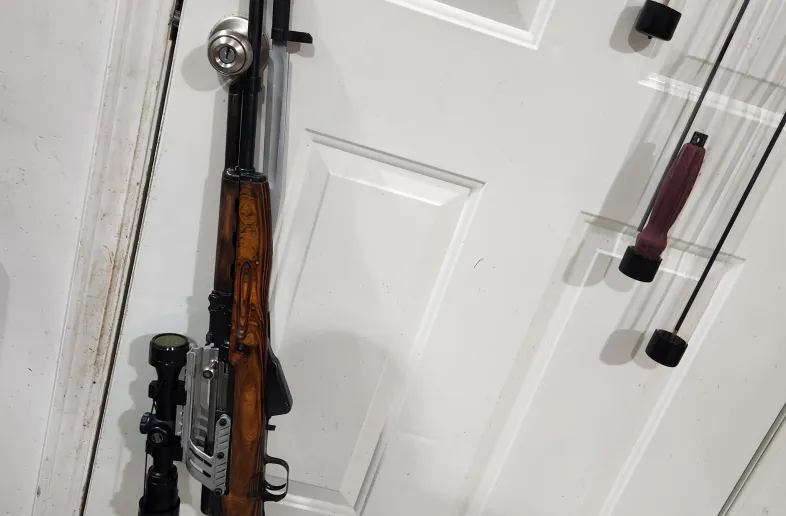 Modified SKS, action is beaded, see trough scope base, with bushnell scope, stock extended plus recoil pad added. Leather custom made Cheek erase added. Early production, see low serial number. Only magazine not matched, like all skses. No any stamp or mark on reciver cover, can not tell is a tula or izzy made. Spring loaded firepin, rifling very sharp. Way better then late production. Test fire by self 60 rds, no any issue. Cleaned completely. Don't need remove a scope base for take a part completely.