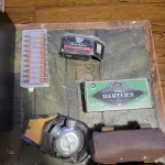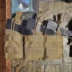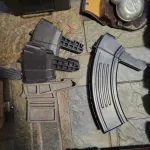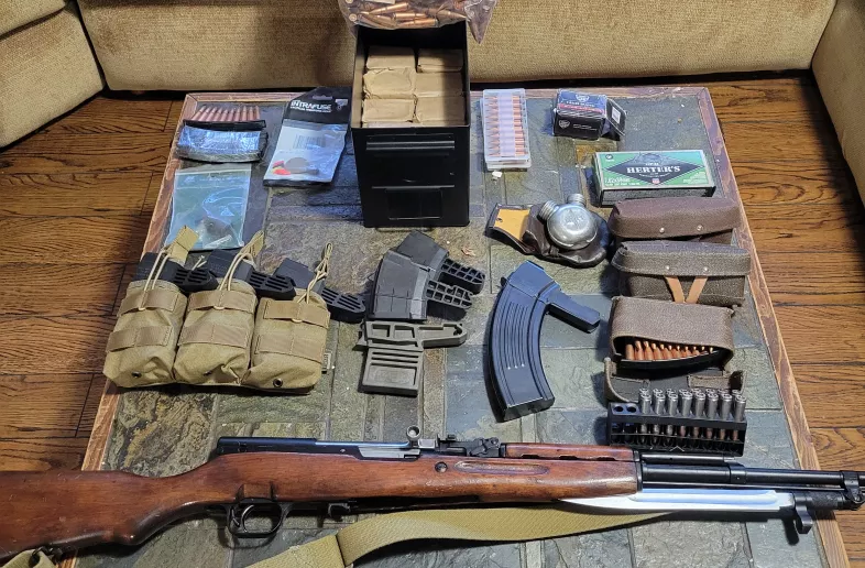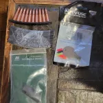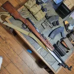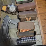 Newer 3 mag pouch, 3 vintage ammo pouches, a good handful of strips, muzzel break, neon iron sights, vintage oil container with pouch. Does not come with the black steel ammo box. Maybe will for extra 20 bucks.