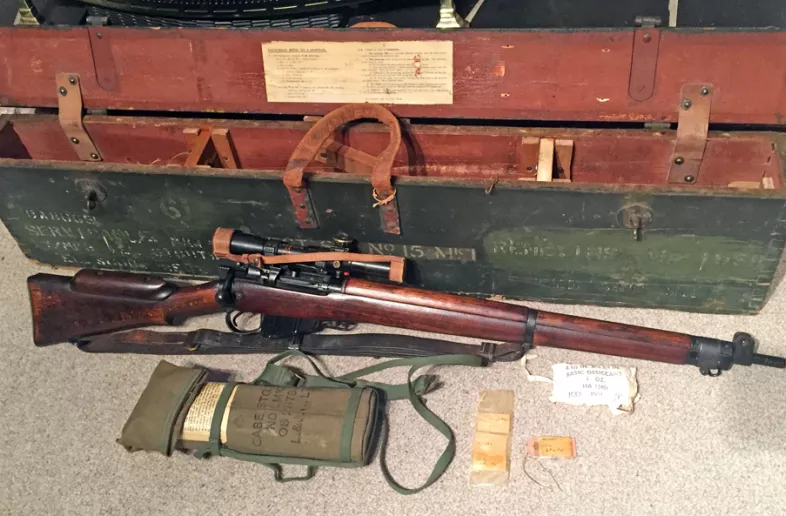 This rifle was built as a Trials No. 4 Mk. I in 1931 by Royal Small Arms Factory Enfield (R.S.A.F. Enfield). Only 2,479 Trials No. 4 Mk. I rifles were made. In 1941-1942 it was one of the first 1,403 rifles converted by R.S.A.F. Enfield into sniper equipment No. 4 Mk. I (T). The rifle then served in the British Army through ALL of WWII (if only we knew where it served – Sicily, Italy, D-Day in Normandy, Belgium, Holland, Germany, Burma etc.?) and post-war service. In 1945 or later, it went through Factory Thorough Repair (F.T.R.). At that time a fresh 1945 barrel was installed and a new No. 32 Mk. 3 scope was fitted. This was all done officially as the rifle remained in service to at least Feb 7 1963 when it was checked and packed away.