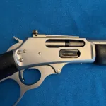 For sale, a superb Marlin Trapper in 45/70, model 1895 TSBL. Barrel is 16.5". It has a black on black webbing hdwd stock, so no plastic here. This rifle has been shot 10 times, so it is no longer new unfortunately. It is still in perfect condition. It comes complete with original packaging