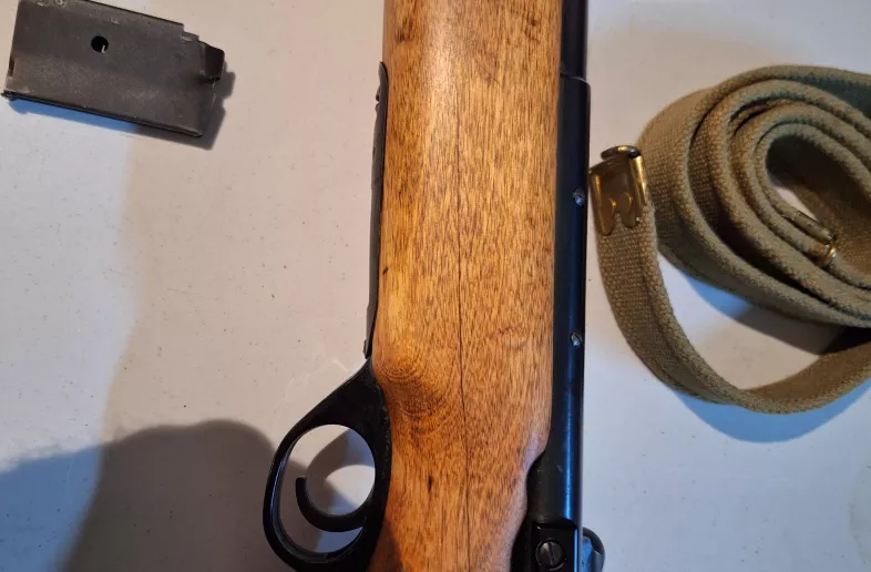 Good condition. Hairline crack in the wood, cosmetic. Doesn't effect the guns performance.