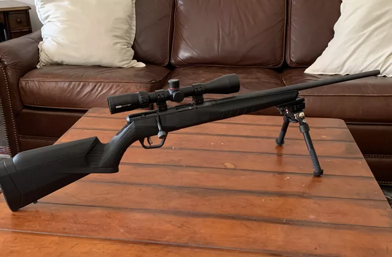 Savage b22 chambered in 22wmr. In like new condition. Topped with a Simmons pro hunter 3-9x40 scope. Also comes with a detachable bipod and picatinny rail adapter. Most of a box of ammo included for a local deal.