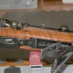 The scope is a Redfield “wide field” variable 1.5x – 5x mounted on a rugged Leopold one piece mount, The POI has not changed in 10 years. Open sights comprise a folding leaf rear and a ramped gold bead front with a protective hood.