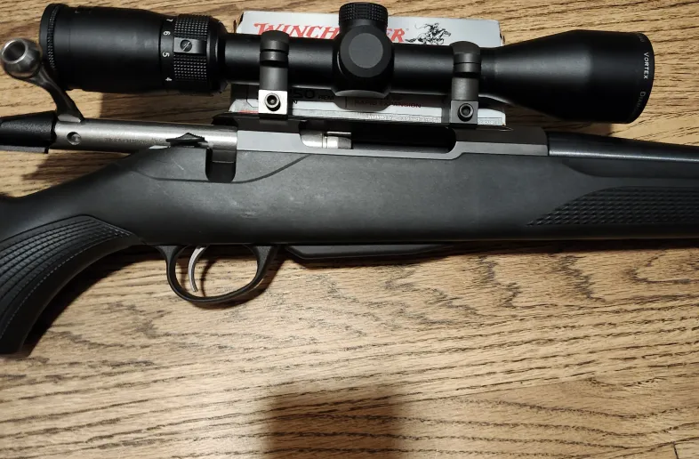 Has had 12 rounds thru it to site it in. Vortex Diamondback 3x9x40 scope, box of shells and shipping included.
