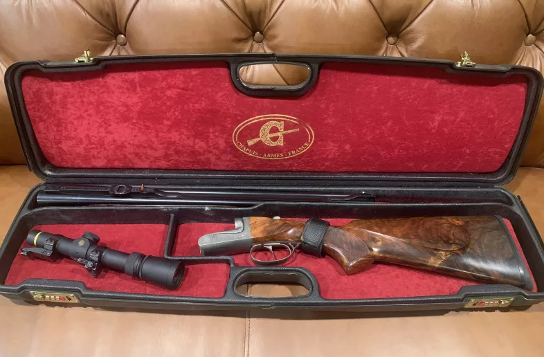 For sale or trade is a French Chapuis Armes double rifle chambered in 8x57JRS with high grade Turkish walnut and ejectors.